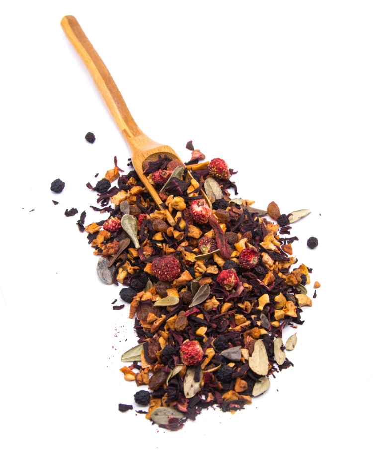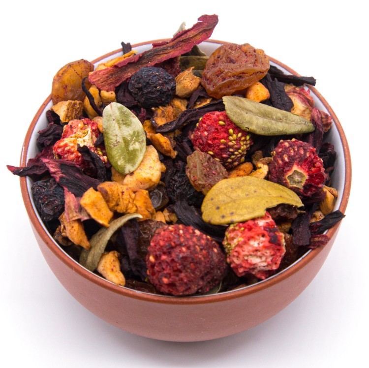 Кусочки яблок, изюм, арония, шиповник, листочки брусники, ягоды земляники и облепихи, аромамасло клубники