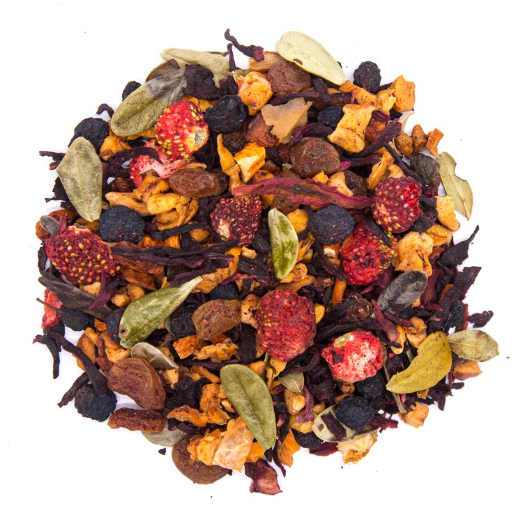 Чай из кусочками яблок, изюмом, плодами аронии, шиповником и листочками брусники, дополненный цельными ягодами земляники и облепихи – это настоящий вкусовой праздник. Кусочки свежего яблока придают чаю сладкую и сочную основу, а изюм добавляет нотки терпкой сладости и легкого аромата. Плоды аронии, известной своими полезными свойствами, придают напитку небольшую кислинку и яркий вкус. Шиповник, богатый витамином С, добавляет слегка кисловатую пряность и витаминный аромат. Листочки брусники придают напитку особый аромат и нюансы ягодной свежести.