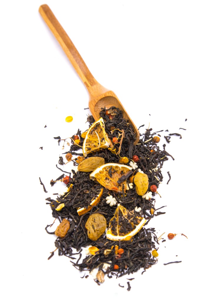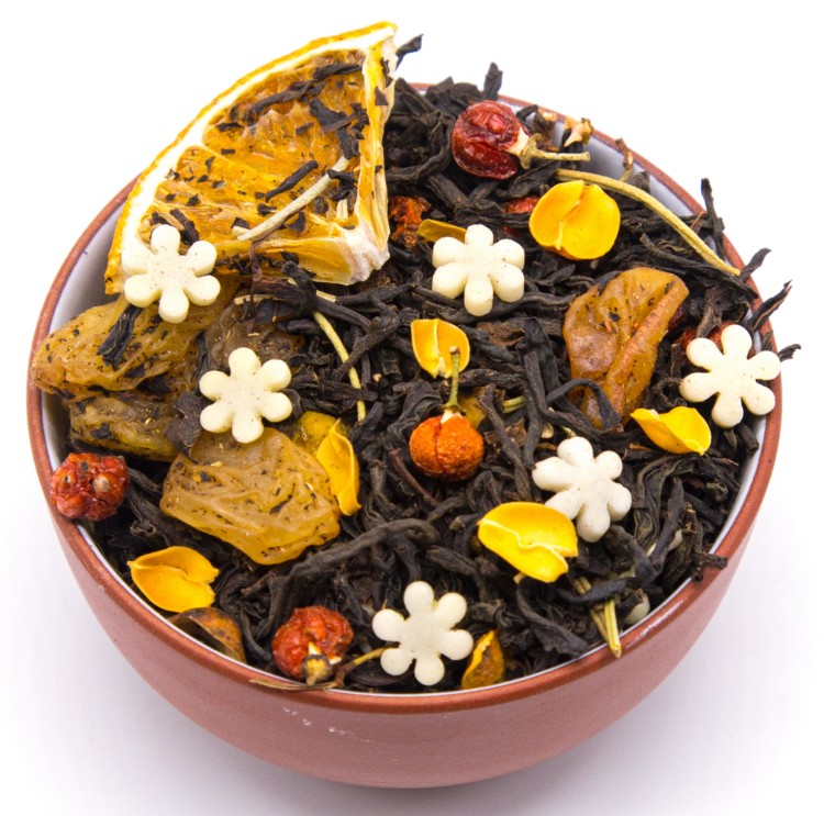 Чай черный индийский, изюм, акация цветы, посыпка кондитерская декоративная «Снежинки», апельсин сегмент, розмарин, аромат "Рождественская выпечка"
