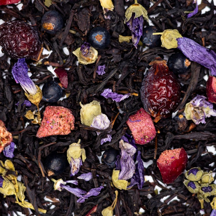 Чай черный индийский ассам, ягоды можжевельника, шиповник резаный, чабрец, мята перечная лист, мальва цветы, ягоды черной смородины, пищевой ароматизатор